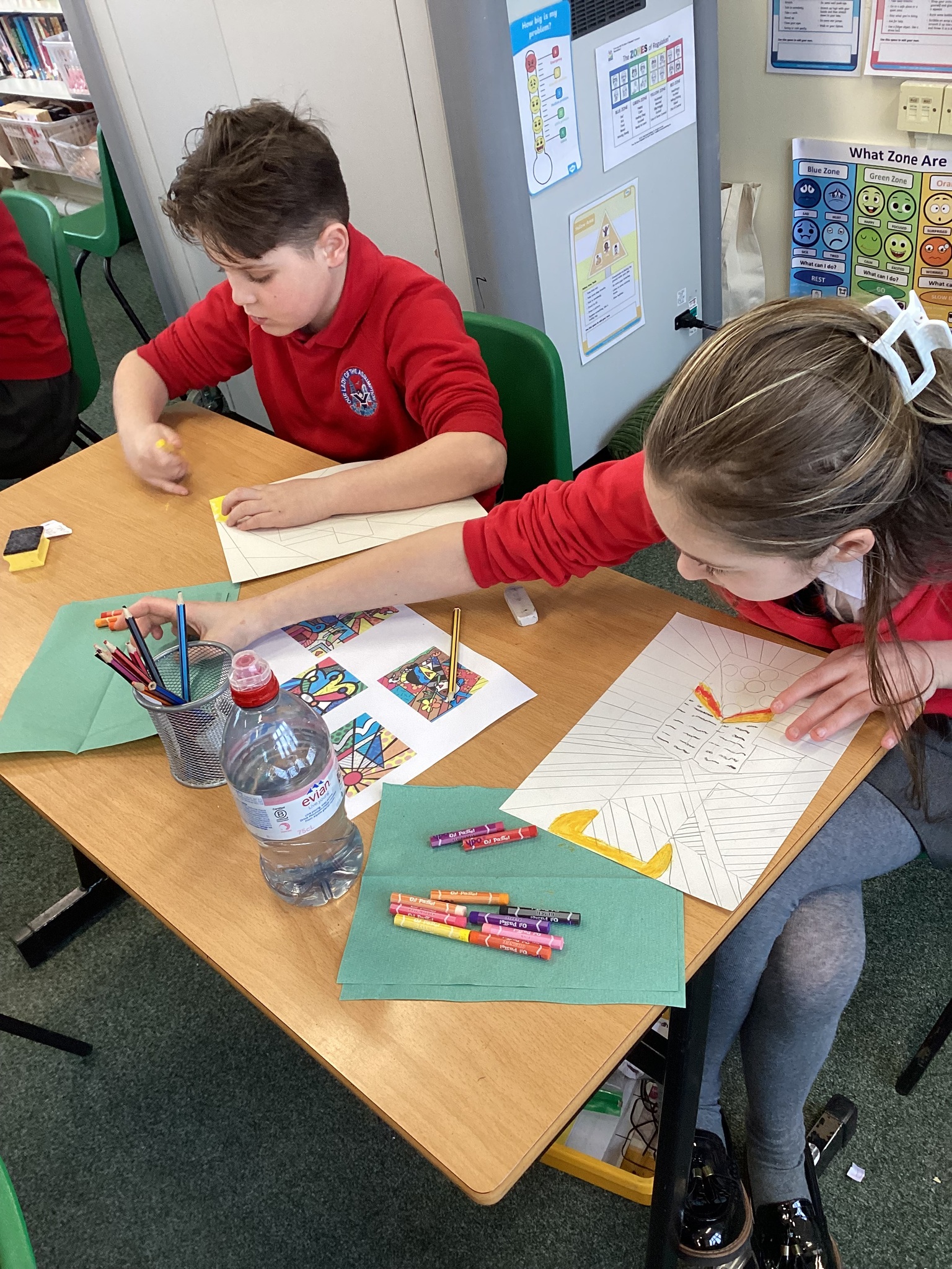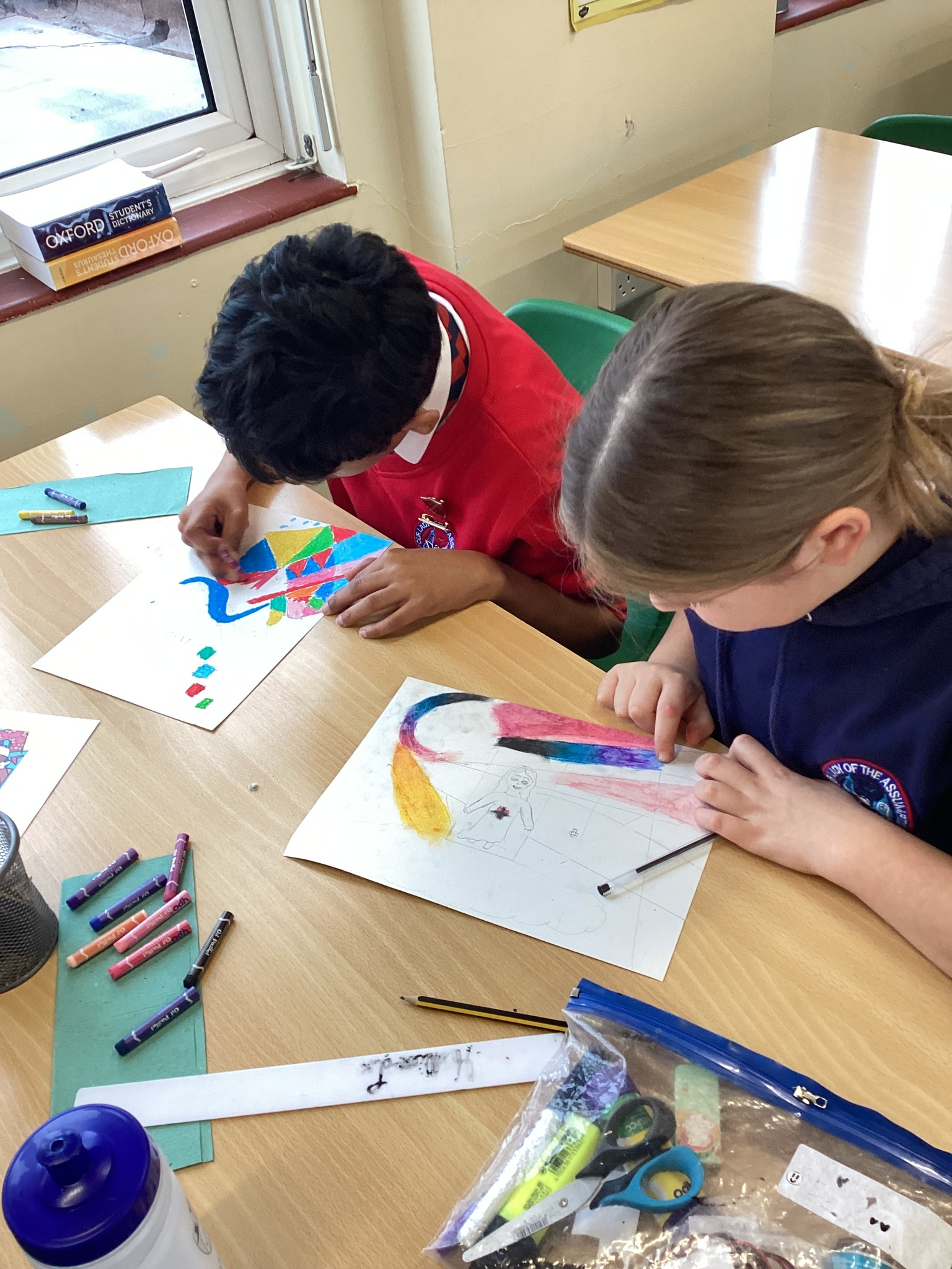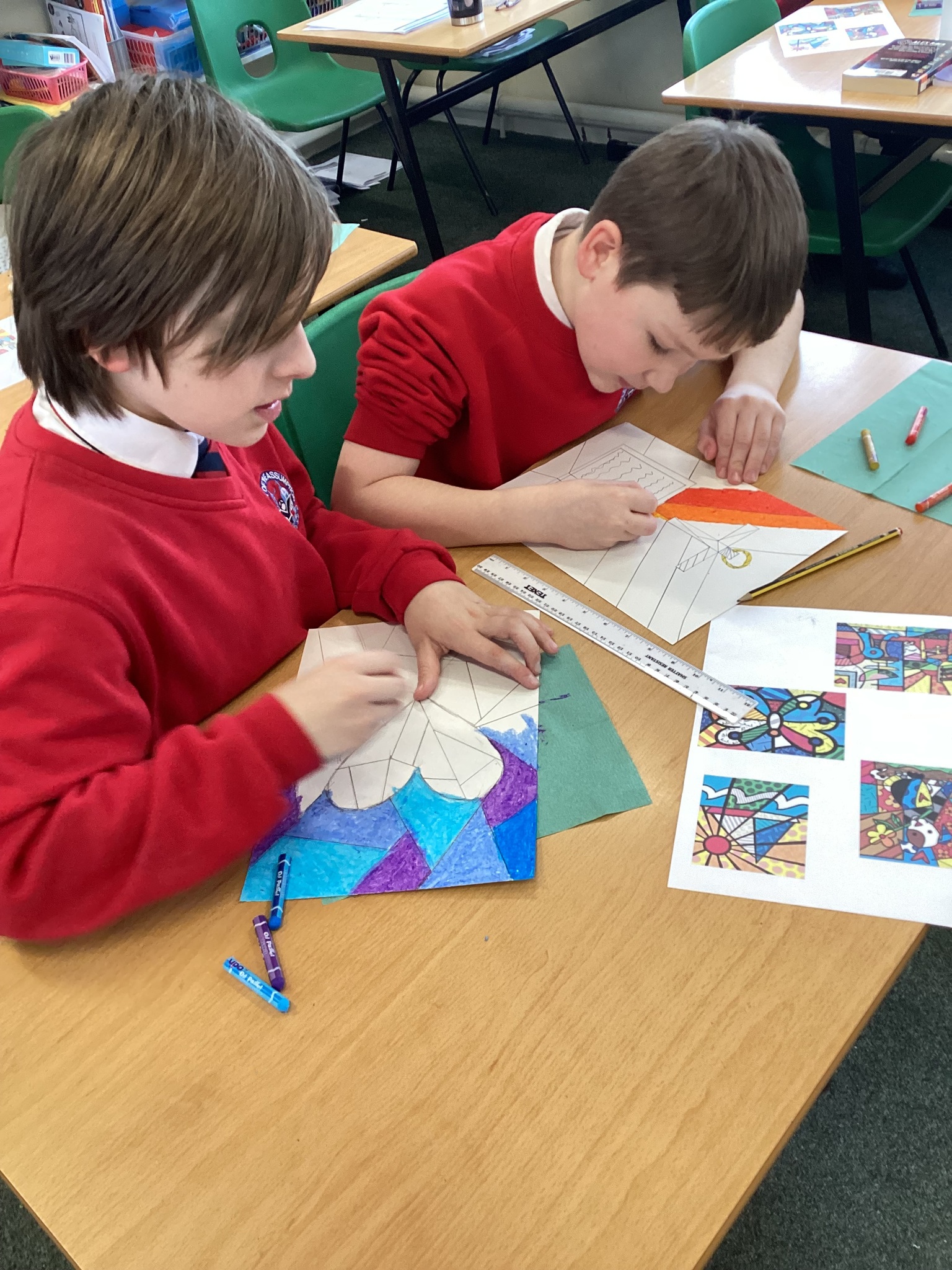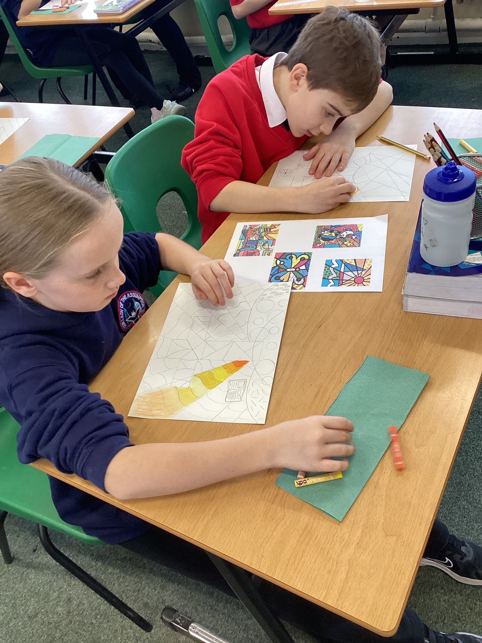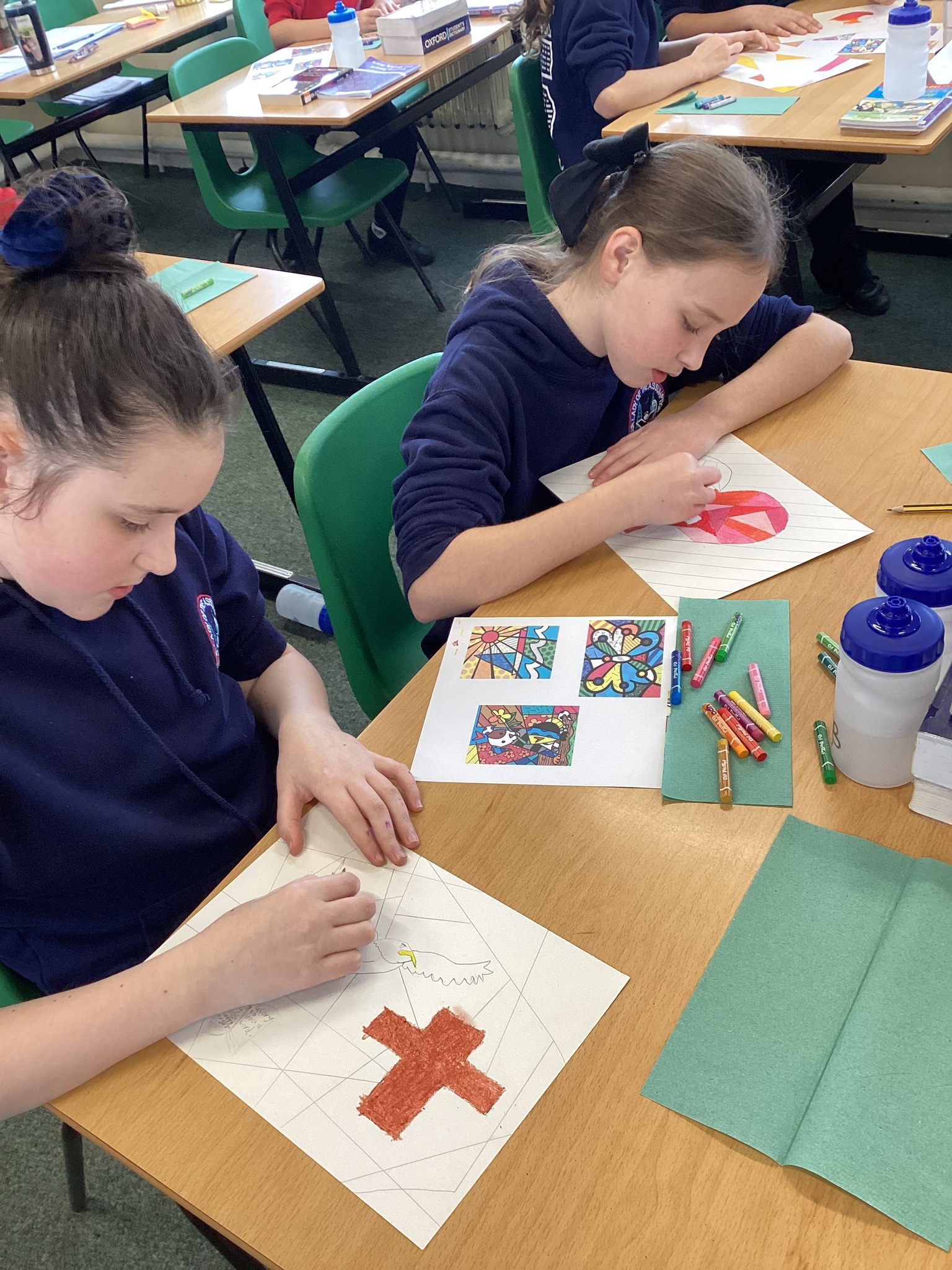 In Art we were inspired by the art of Romero Britto to create our own piece of religious art. We linked it in with our RE learning of John's Gospel and Jesus' divinity. In our lesson today we applied oil pastels to our art work.