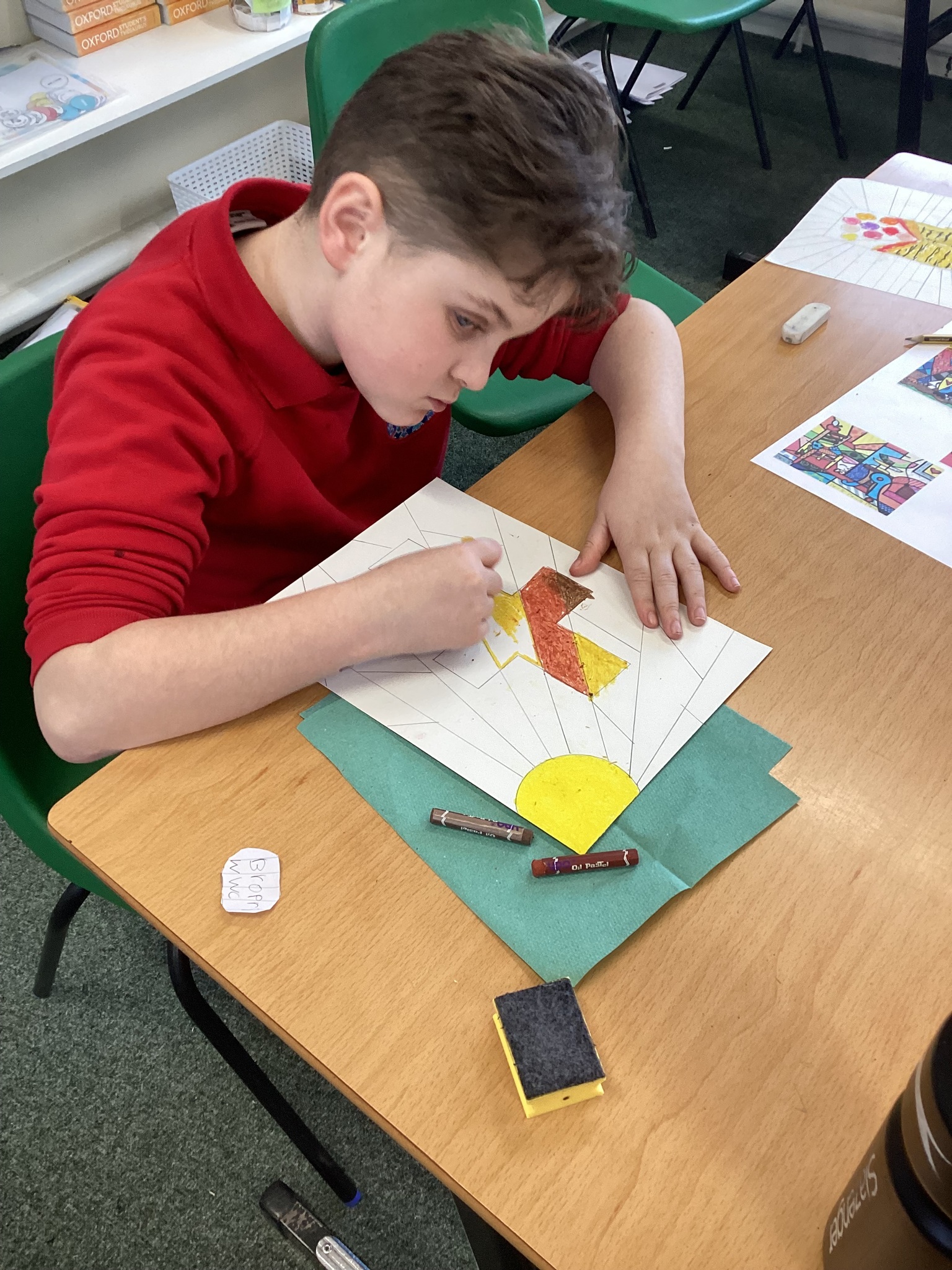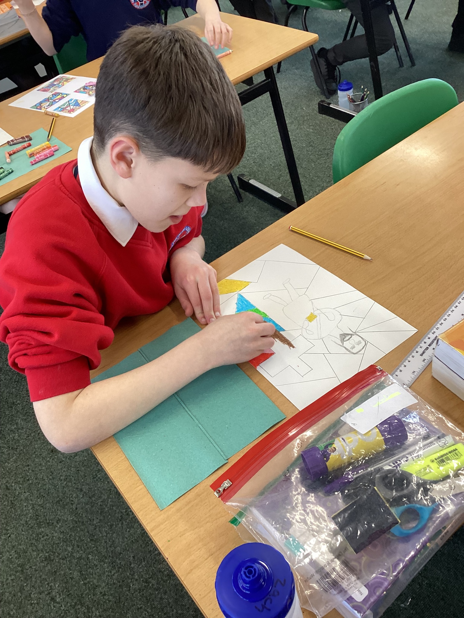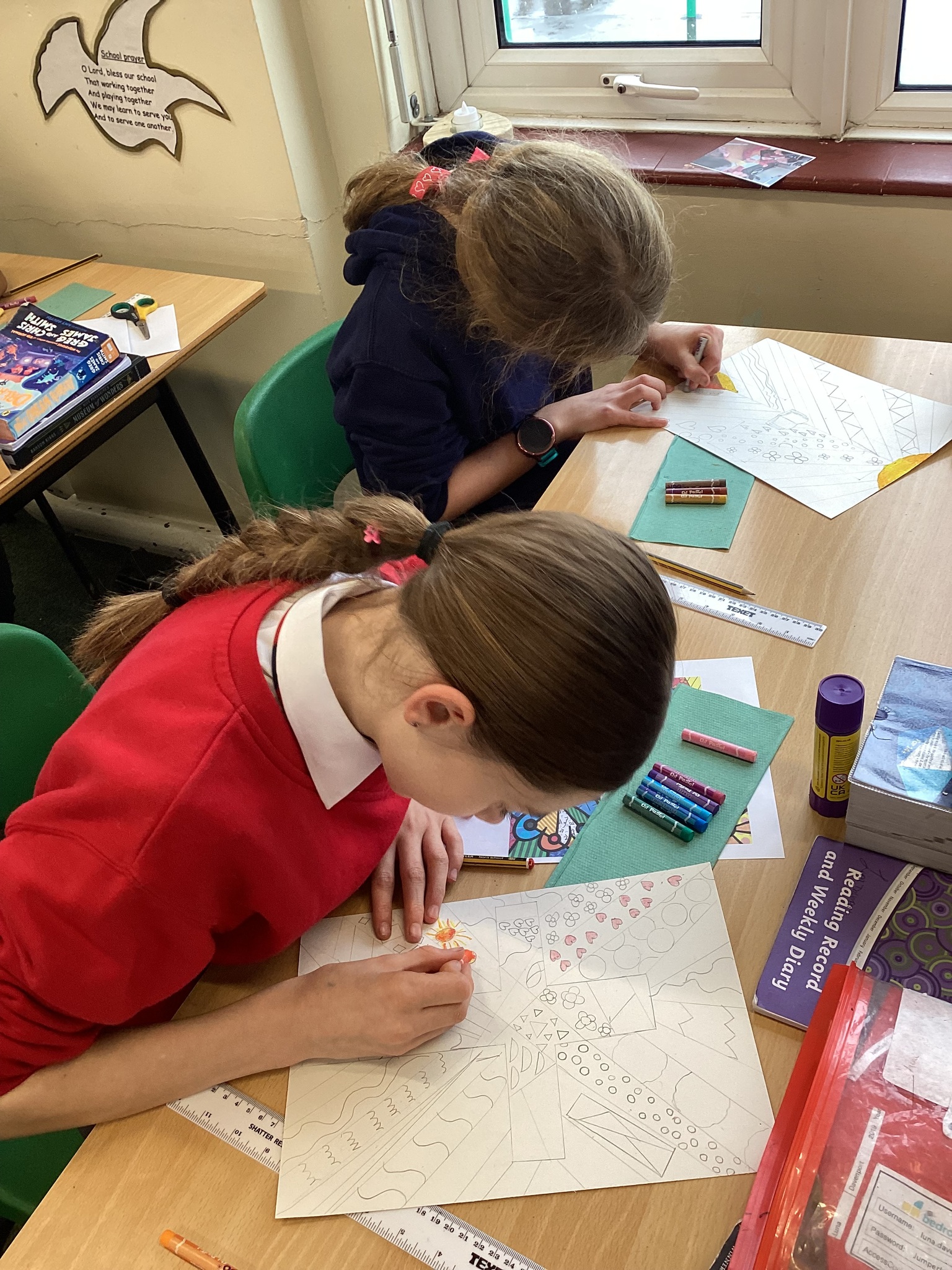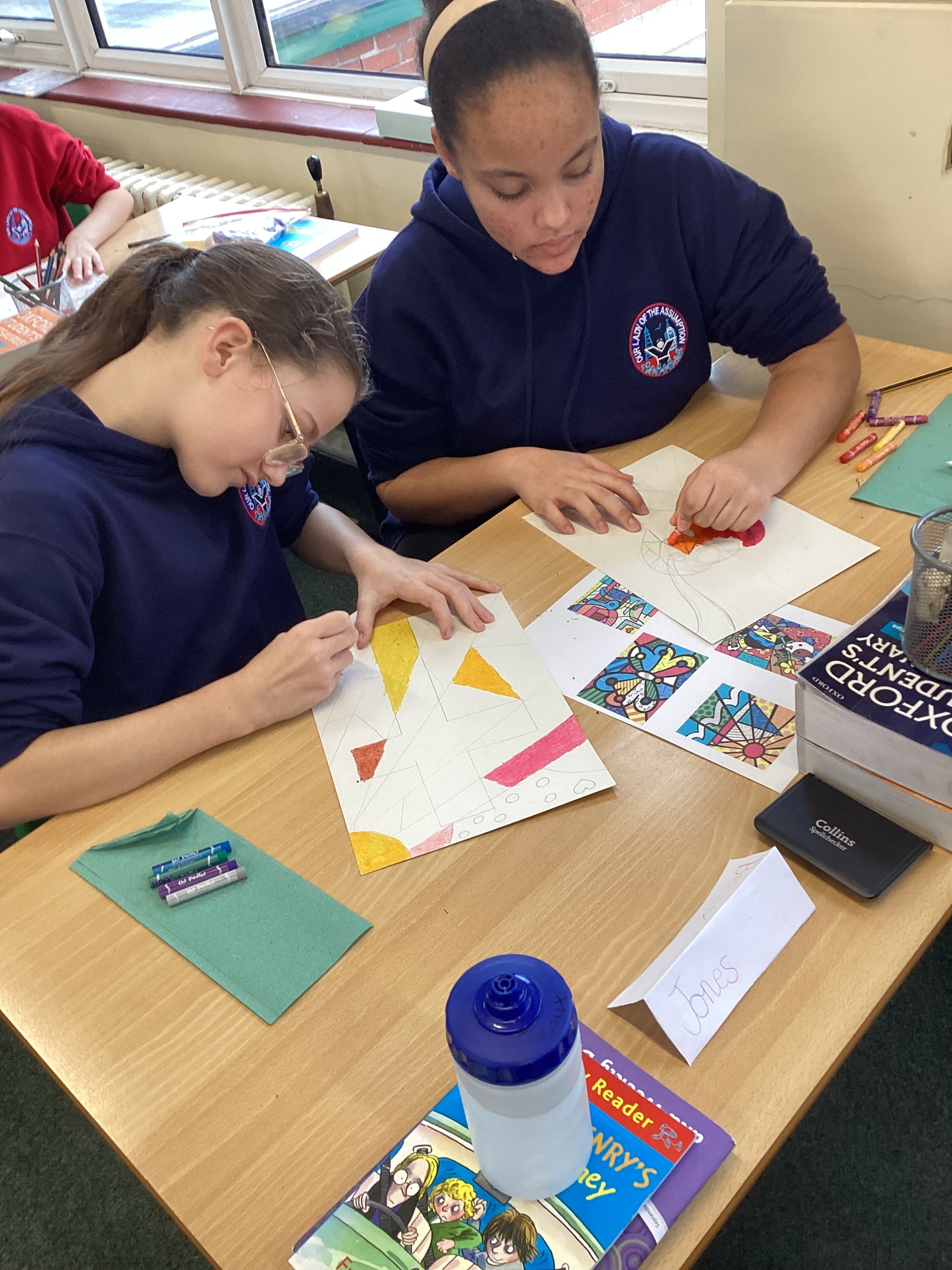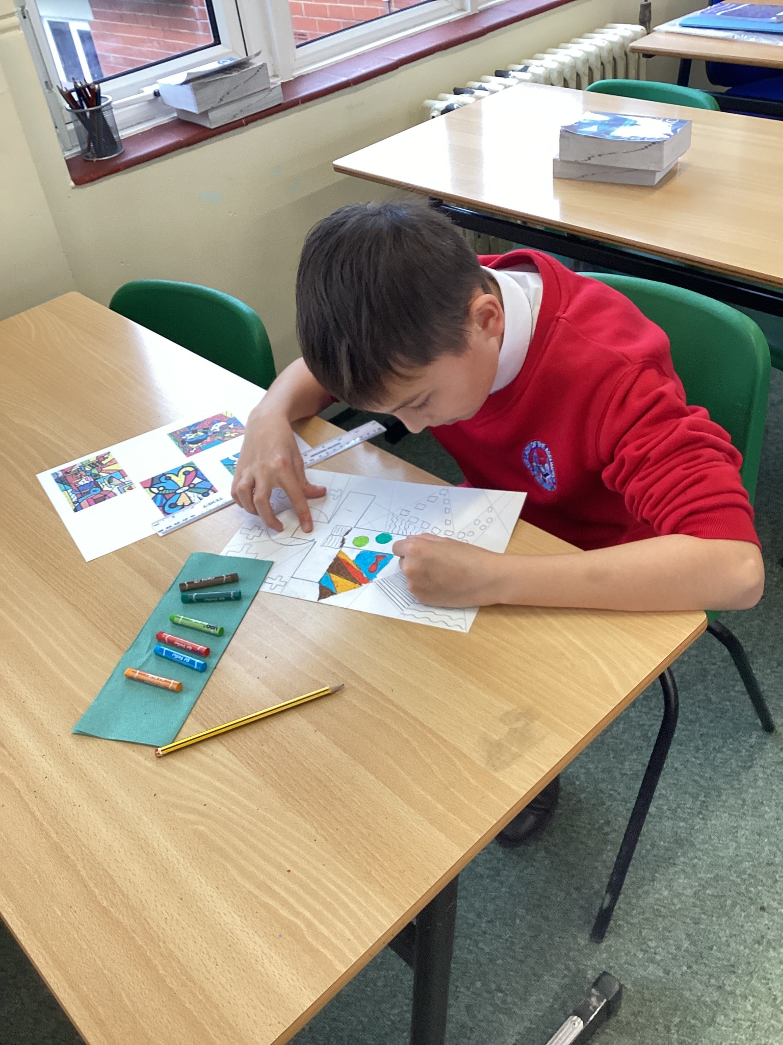 In Art we were inspired by the art of Romero Britto to create our own piece of religious art. We linked it in with our RE learning of John's Gospel and Jesus' divinity. In our lesson today we applied oil pastels to our art work.